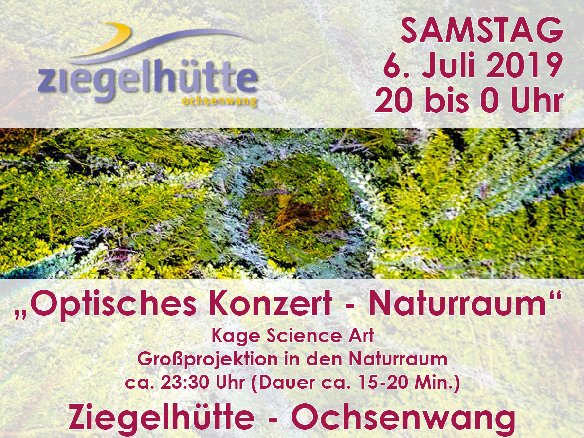 Innerhalb des Lichterfestes der Ziegelhütte in Ochsenwang zeigt die Familie Kage als runden Abschluss der Veranstaltung Ihr „Optischen Konzert“ im Naturraum. Über der Bühne, auf der kurz zuvor noch MISS FOXY dem Publikum einheizt, erstrahlt das Blätterdach in einem Formen- und Farbenrausch von mikroskopischen Aufnahmen zu sphärischer Musik.