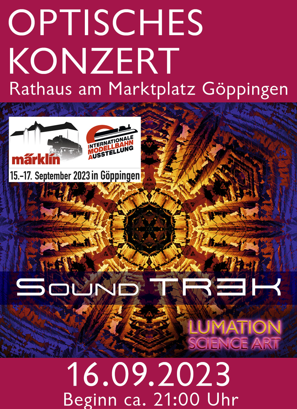 Unser "Optische Konzert - Sound TREK" wird am 16.09.23 in Göppingen von unserem Familienkünstlerkollektiv "Lumation Science Art" übrigens als eine kleine Weltpremiere mit ergänzenden Farblaserprojektionen und KI-Kunst aufgeführt.