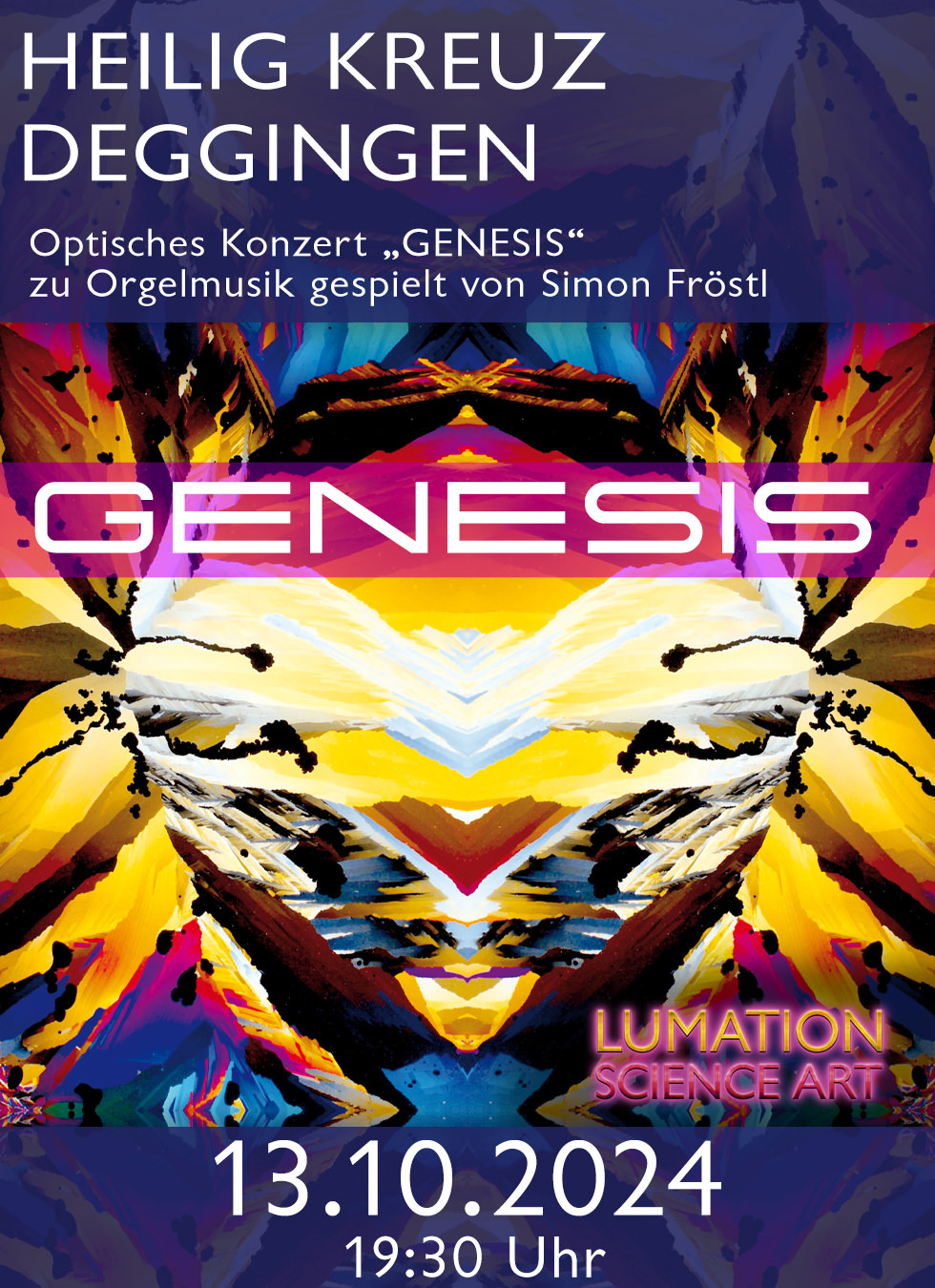 Lumation Science Art spielt ihre Live-Performance interaktiv zur ebenfalls live erklingenden Orgelmusik von Simon Johannes Fröstl, der sowohl Orgelliteratur aus verschiedenen Epochen bis hin zur Filmmusik zu Gehör bringen wird, als auch in Improvisationen die optischen Eindrücke in die Sprache der Musik übersetzt. Die vielfältigen klanglichen Möglichkeiten der neu sanierten Orgel kommen hier besonders intensiv zum Tragen. Die Musik verschmilzt dabei mit der faszinierenden Lichtshow und visionären Multimediakunst des Künstlerkollektivs, welche die historischen Mauern der Kirche in dieser einzigartigen Form zum Leben erwecken. „Wie durch unterschiedliche Töne eine wunderbare Melodie erklingen kann, so lassen uns die unendlichen Formen der Kristalle die harmonischen Strukturen des Universums erahnen.“ Der hier zitierte Erfinder des „Optischen Konzerts“ ist Professor Manfred P. Kage, der heute als einer der wichtigsten Multimediapioniere genannt wird. Er präsentierte seine Multimediawelten bereits ab 1959 als Groß- und Mehrfachprojektionen in Echtzeit und interaktiv zur Musik gespielt - wie eine Art Klaviatur in der Analogie zu einem musikalischen Konzert. Kages "Optische Konzerte" wurden rund um die Welt aufgeführt, bei den Olympischen Spielen, der Biennale, der Expo, der ars electronica, im Museum of Modern Art in New York und im ZKM Karlsruhe, um nur einige Beispiele zu nennen. Dieses einzigartige multimediale Projekt wird heute von seiner Familie fortgeführt und stetig weiterentwickelt. Der Titel „Genesis“ („Schöpfung“) steht für die Grundlage der optischen Kunstwerke: alle gezeigten Aufnahmen stammen aus der Natur und sind Teil der Schöpfung. Lumation Science Art beleuchtet in ihren Lichtperformances das Unbekannte und Verborgene, die Ornamente und Metamorphosen unserer Welt und versteht es, die Gäste auf eine Reise mitzunehmen, auf der alles möglich zu sein scheint: Die Überwindung von Raum und Zeit, Dimensionssprünge von den allerkleinsten ästhetisch-schönen Mikroorganismen und den Anfängen des Lebens zu fernen Kristallwelten und modulierten Farben- und Formenfeuerwerken der Schätze der Natur von atemberaubender Schönheit. „Genesis“ bietet den Besucherinnen und Besuchern ein unvergleichliches audio-visuelles Abenteuer, innerhalb dessen sie in gänzlich neue Welten eintauchen können und eine besondere Verbindung von Bildern und Klängen erleben dürfen.